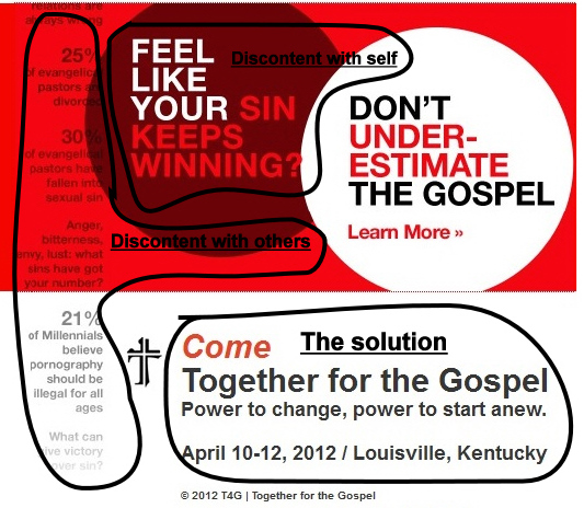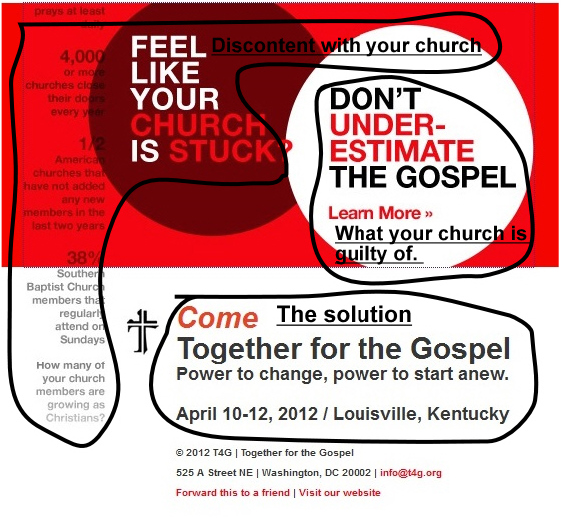 One of the key objectives in advertising is to create dissatisfaction with what you have, and then offer a solution. In the email advertisements I have been receiving from T4G, that is exactly what they are doing in regard to our personal walk and our church affiliations. Think about that—the goal is to create dissatisfaction with yourself, others, and your church. Not only that, we Christians have a tendency to be hard on ourselves and even harder on our church to begin with. To point out the things that Christians struggle with in regard to themselves and their church, and then claim to have the solution, is a form of manipulation that is unbecoming of men who call themselves elders.