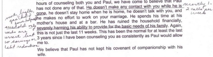 I am not arguing that I was sinless, or that my family never struggled financially; I am arguing that a formal document giving my wife the green light to divorce me should be the epitome of truth in every word, and if it isn’t, they should be as big as the gospel they confess and make that right. They should at least confess indisputable sloppiness in this grave matter, not withstanding the casual mention of “misreading records” in the matter of my excommunication. A “misreading” attended by two elders who were supposedly counseling me!