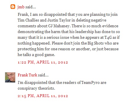 I’m the “jmb” who was called, along with a couple others, a “conspiracy theorist” by Frank Turk. When I emailed him proof of my claims, he deleted it, but did not delete his attack on us. The next day, he wouldn’t drop it, and made a “conspiracy theorist” crack on Twitter. I twittered him that he was a coward who deleted evidence that contradicted him.