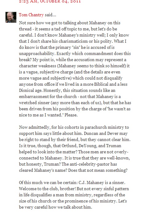 Tom Chantry has a strange interpretation of Matthew 18. I mean CJ Mahaney WAS SGM. He WAS the church.