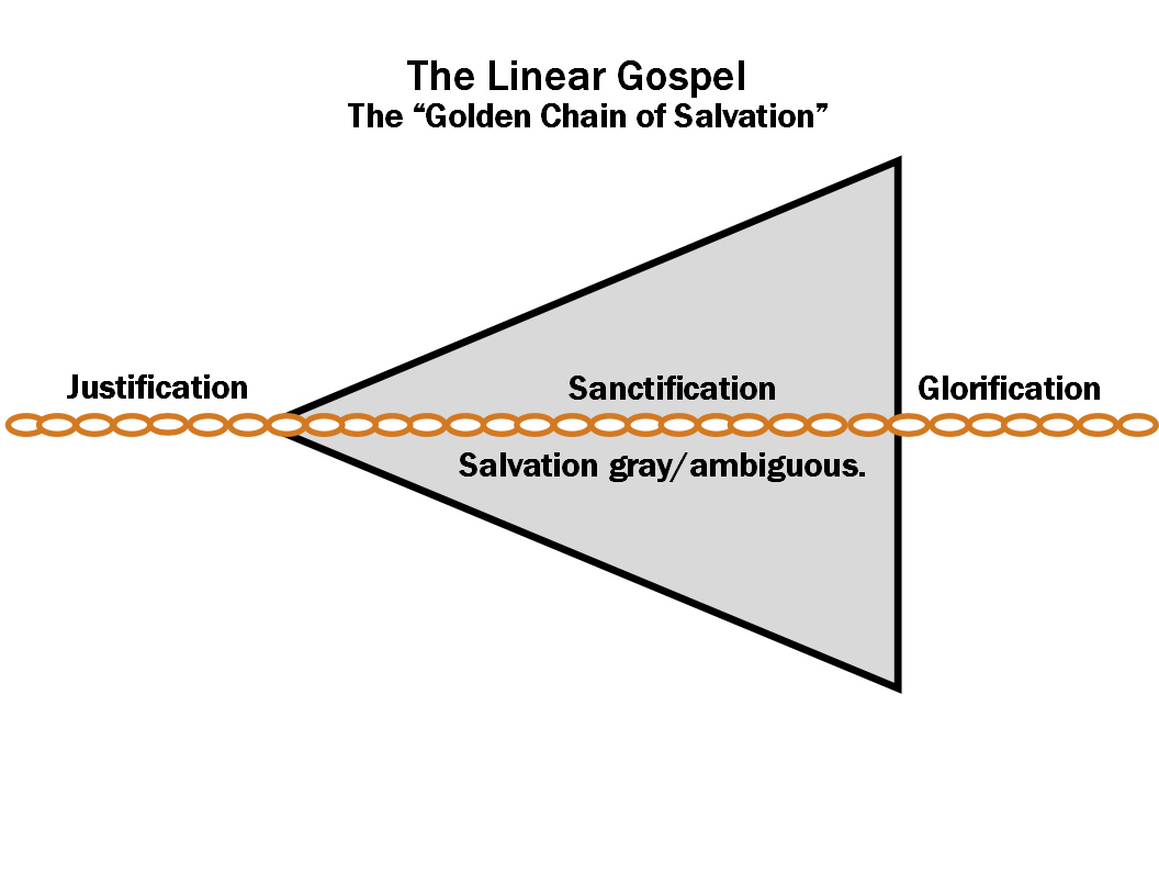Paul seems to be saying what I used to say: our original salvation culminates into a final salvation. At TANC LLC, our research institute, we call that the “linear gospel.” In Reformed circles it is called the “golden chain of salvation.” Now listen, this is a really big deal. One must choose between the linear gospel and the parallel gospel. Let’s look at the illustrations below: