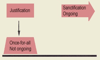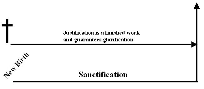 I would also like to use their illustration to make a point. They, in representing the Reformed view take issue with justification being finished. They believe it is ongoing, but look what they call it: “sanctification.” Why wouldn’t they call it “ongoing justification”? Normally, the term for the Christian life is progressive sanctification, but Reformed theologians stay well clear of the term progressive justification. The only exception is in the Calvin Institutes (3.14.title). At issue is what they illustrate with model E—justification and sanctification are combined. Salvation is a progression and worse yet, we are in the midst of the progression. That means we can mess up the progression, this is an unavoidable inference, and is indeed an element of Reformed thinking.