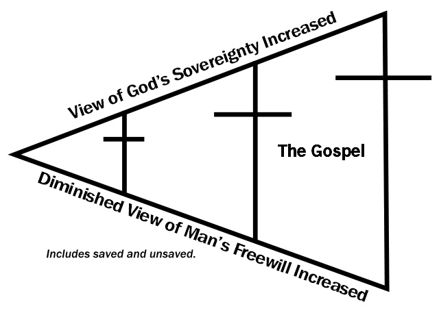 We have established that sovereign would be the wrong word to describe God as causing all that happens, and those things being according to His desired will. It has also been mentioned that the word “sovereign” is not in the Bible. Even if sovereign did mean that all things are predetermined according to God’s pleasure, would it be correct to make that part and parcel with the gospel as most do in our day? Below is yet another version of the infamous Cross Chart that can be applied to this question: