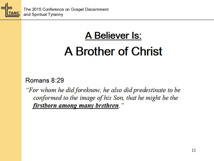 I’ve underlined the key phrase in that verse. If you study the grammatical structure of that verse, “firstborn among many brethren” is speaking of the Son. And the preposition “among” is inclusive. It indicates inclusiveness. If you are among something you are part of it. If you are among the crowd you are included in the crowd. What Paul says here is that there are many brethren, and Jesus is one of them, more than that, he’s the oldest. He is the firstborn. And if we think back to our study of the Body of Christ, the New Man, His right as firstborn makes Him the Head. How is it that Jesus is firstborn? He was the first resurrected following the ending of the law. And as such, each believer, by virtue of the new birth is resurrected just like Christ, we are born anew, as new creature that is not under law. A new creature that is also a child of God. And if we are a child of God, and Jesus is the Son of God, that makes Jesus our brother. Our oldest brother, our firstborn brother. We see this same idea expressed here as well.