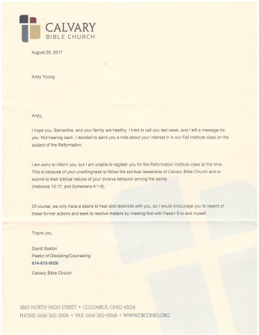 Andy, Paul: I am writing this with strained fingers and with an invisible hand covering my mouth. The letter from that “church” is pure blasphemy. They are playing “god”; they are evil. I hope they see my response; so let me repeat it slowly: That “church” is evil. Who the hell do they think they are? Andy, you must first repent (of telling the truth?) and/or submit to this false church’s “Biblical rebuke” before you are allowed (here they are playing “god” again) to be enrolled in their class about their idols’ Deformation?