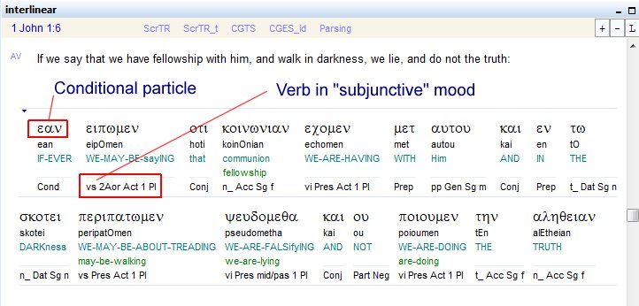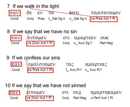 The apostle John is actually presenting a series of rhetorical arguments against this brand of gnosticsm. A close inspection of the grammatical structure of verses 6 through 10 reveal the hypothetical nature of his arguments. At right, here is a screen shot from my interlinear Bible software.