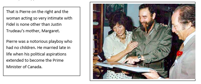 Pierre Trudeau, Justin’s “father” (a major Canadian political player) was an admirer of all things Marx and an open supporter of Fidel Castro.