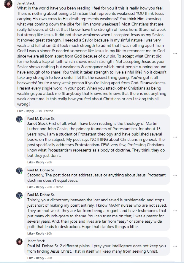 Again, the exchange I had with the aforementioned person several weeks ago is a classic illustration of what I am writing here. It started with an article I wrote about the 1/3 Protestant ideology of total depravity/total inability (under the category of intellect) of man and how it is a contraindication to nursing. Due to time constraints, it was a very short post, so I will cite the whole post: