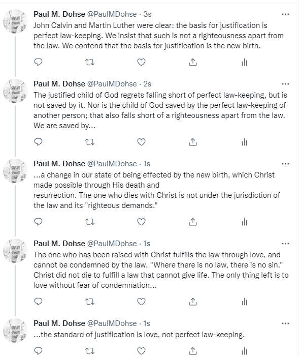 I would have to respectfully disagree. Perfect law-keeping has absolutely nothing to do with justification. Christ was a manifestation of righteousness APART from the law. I get it; the idea that perfect law-keeping is the standard of justification has been drilled into our heads for over 500 years. In addition, perfect law-keeping has nothing to do with love at all, while love does fulfill the law totally. Furthermore, truly saved people love the law and do obey it, but when they fall short, there is no law that condemns them, it is rather a failure to love. To ask, “Well then, how much love does it take to fulfill the law?” misses the point entirely and is under-law thinking. I believe we are talking about a focus on a direction of love, not a perfection of love because we are still weak. And, by the way, weakness is not sin. The angels are weaker than God, but they are still holy. Christ was weaker when he came as a man, but yet holy. We are weak, yet holy. We must remember that Protestantism, as an under-law religion, teaches, without equivocation, that sin committed as Christians is condemning sin requiring re-justification/re-salvation. With Protestantism, grace is a covering for remaining under law. NO, you are either under one or the other, and one is lost, and the other saved. With that said, we must also remember that Christ’s blood was not a covering for sin (“atonement”), but an ending of sin.