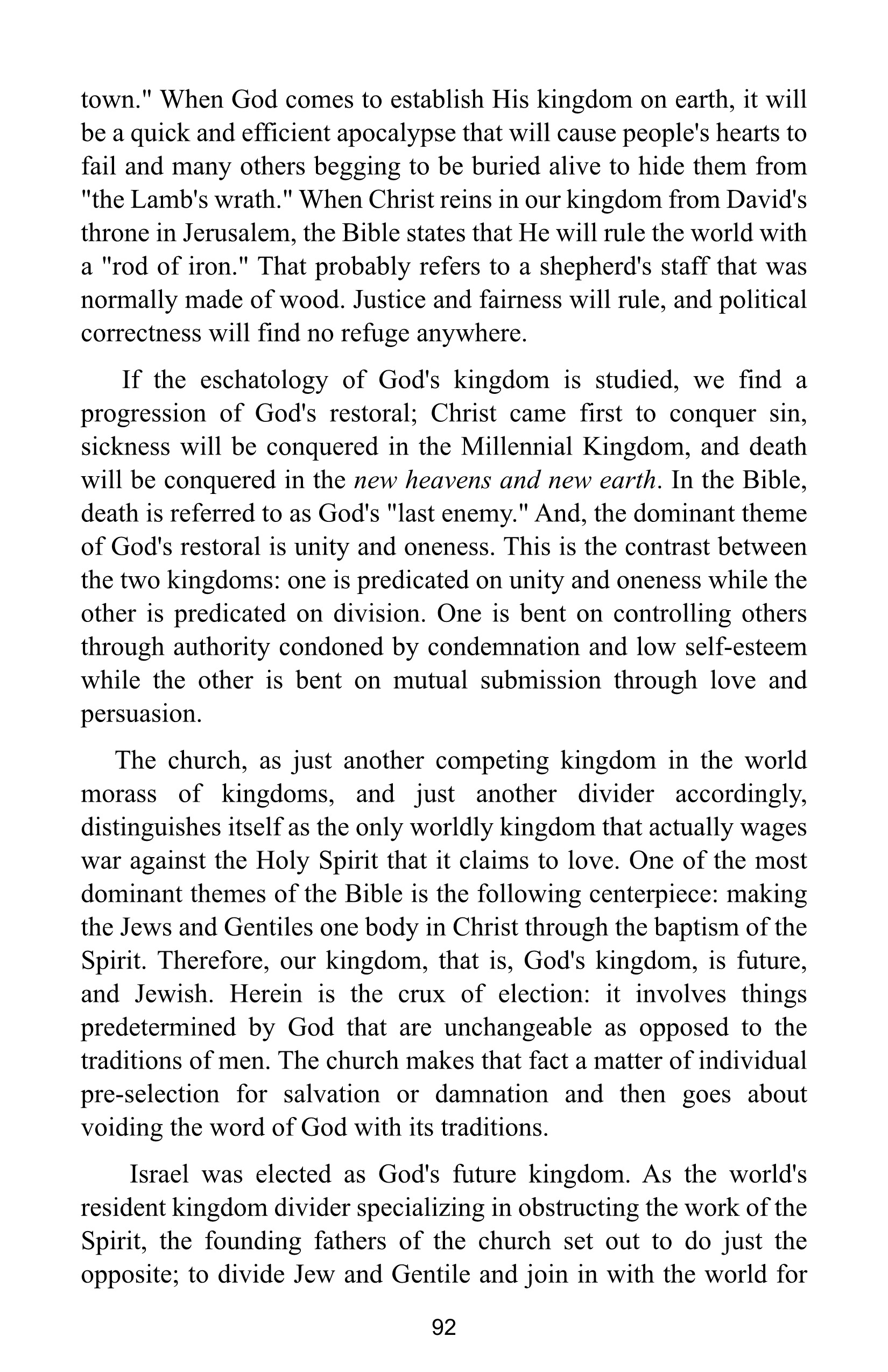 I guess I’ve never really taken the kingdom nonsense seriously. Its just Judaizing. There is no need for a present kingdom nor a future kingdom. This is the foolishness of the Jews. “The kingdom of God is within you” is only a realization that God has always been king so the kingdom cannot “come” as if it didn’t exist before. Those who believe the kingdom began at a certain point or will, they serve a weak limited pagan god lowercase (like the Jews do). In the Lord’s prayer “on earth as in heaven” modifies all 3 first petitions (sanctify thy name, thy kingdom come, thy will be done) and thus does not pray for the kingdom to come as if it was not here before but for an increase in our understanding that it has always been here, inside us, because God has always been king.