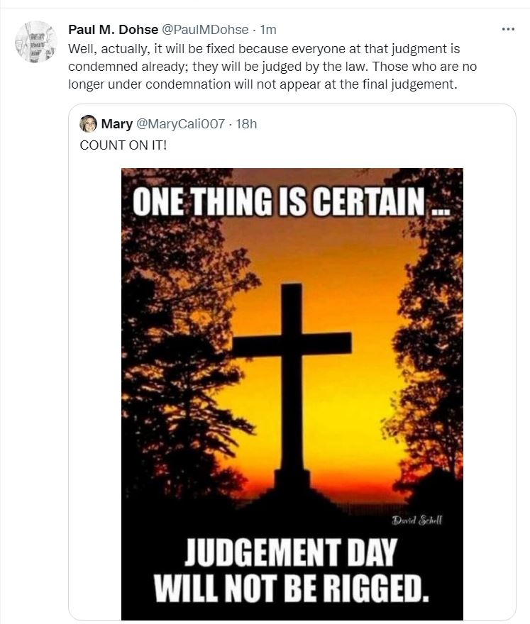 Our Lord prefers obedience over sacrifice—this is something that the second generation purveyors of death will never understand. Mankind is always working. A choice to do nothing is not faith—it’s a choice that will either produce death or life. And it doesn’t matter who obeys the law in our place to keep us justified—there is no law that can give life no matter who keeps it. So, how do we know for certain that we are not trying to justify ourselves by obedience in our Christian life? Because law and justification are mutually exclusive to begin with, and justification is a finished work accomplished by God only. As Andy Young said in this year’s TANC Conference, “The law is for sanctification.” Indeed, especially since we have already been justified “apart from the law.”