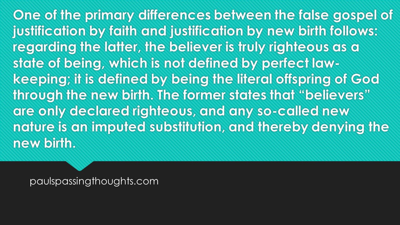 We are justified by the fact that God’s seed is in us because of the new birth (1John 3). This is justification by new birth, not the Protestant justification by faith alone gospel, which is far from being a salvation by faith alone apart from works. Protestantism utilizes so-called faith-alone works that obtain a reapplication of Christ’s work on the cross (ongoing double imputation for “present sin”). One example of this is the Protestant doctrine of “The Ordinary Means of Grace” [read “grace” as “salvation”].