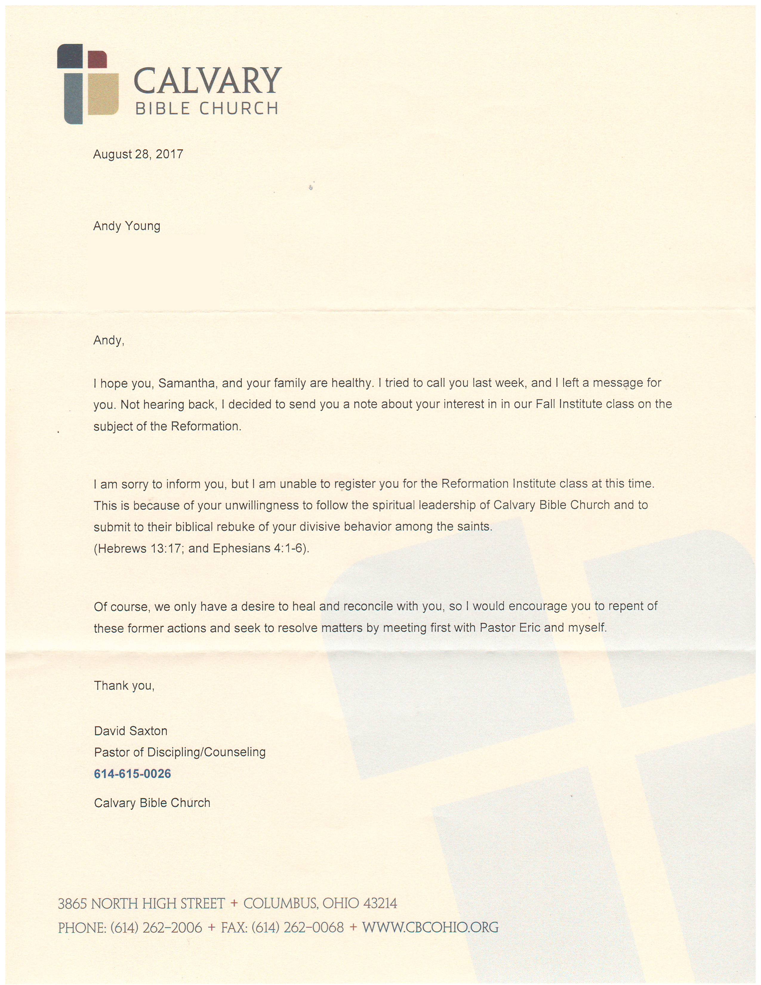 “I am sorry to inform you, but I am unable to register you for the Reformation Institute class at this time. This is because of your unwillingness to follow the spiritual leadership of Calvary Bible Church and to submit to their biblical rebuke of your divisive behavior among the saints. (Hebrews 13:17; and Ephesians 4:1-6)”