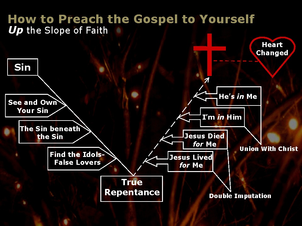 Protestant orthodoxy has a peculiar teaching known as the “vital union.” According to Reformed tradition, we maintain this vital union of “Christ in us and us in Christ” by “preaching the gospel to ourselves.” This is done by searching for sin in our lives so that we can return to the cross for forgiveness resulting in increased salvation. The following chart publicized by several Reformed organizations illustrates the process: