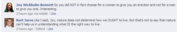 And let’s look at her argument. In regard to homosexuals, deterministic. Go figure. Homosexuals are born with the desires that they have and have no control over those desires. Nobody chooses their desires, they are born with them. During our little tiff, she asked me when I chose to lust after women. My argument was that no Christian is enslaved to any desire save those that please God. I specifically argued that her determinist view was ironically making the homosexual the judge over a pedophile. Both have a desire, but she was judging deterministic desires as having different moral values. One should change, the other can’t?