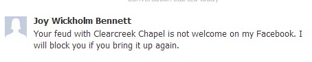 No Joy, as you know, they held me hostage to membership at CCC after I left biblically by letter under threat of ruining my reputation for months. That’s not a feud, it’s a criminal act. And that is ok with you because you are a tyrant just like they are.