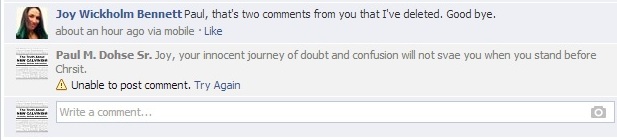 Today, answers seemed to irritate Bennett because she exemplifies a gargantuan problem with the present-day blogosphere: answers are bad for business. The more answers, the shorter the journey. It’s really all about, “Joy in This Journey.” But journeys don’t save; a love for the truth saves (2THESS 2:10). Bennett isn’t looking for truth; she’s looking for more questions. But the greatest disappointment was her excuse for censoring me. I challenged the comments of someone in the stream that both of us used to attend church with. As many know, my 20-year membership there did not end well. Though my initial comments were left posted, she deleted them when I posed a certain argument regarding the subject at hand. Then came the disappointment:
