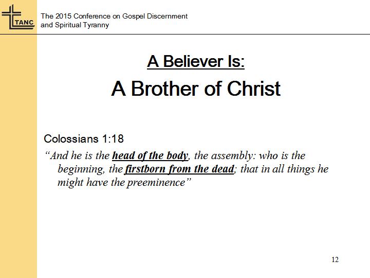 I’ve underlined the key phrase in that verse. If you study the grammatical structure of that verse, “firstborn among many brethren” is speaking of the Son. And the preposition “among” is inclusive. It indicates inclusiveness. If you are among something you are part of it. If you are among the crowd you are included in the crowd. What Paul says here is that there are many brethren, and Jesus is one of them, more than that, he’s the oldest. He is the firstborn. And if we think back to our study of the Body of Christ, the New Man, His right as firstborn makes Him the Head. How is it that Jesus is firstborn? He was the first resurrected following the ending of the law. And as such, each believer, by virtue of the new birth is resurrected just like Christ, we are born anew, as new creature that is not under law. A new creature that is also a child of God. And if we are a child of God, and Jesus is the Son of God, that makes Jesus our brother. Our oldest brother, our firstborn brother. We see this same idea expressed here as well.