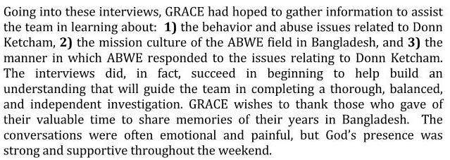 Huh? GRACE “hoped” to gather information? The document is full of tentative, overcautious language. The interviews succeeded in “beginning” to “help” “build” (how big is the building going to be and how long is it going to take to build it?) an understanding? For crying out loud, the FMC have already built the case with all kinds of documentation!! The job is more than half done! And GRACE’s proclamation that God put his stamp of approval on it all regarding their interviews is just classic, and arrogant. But I will again mention that where GRACE will hopefully have some value is in their final ”thorough,” “balanced,” “independent” report; if it gets completed before the second coming. And we certainly don’t want any victims muddying up the waters with their own assessment of getting molested by the ABWE icon, Donn Ketcham—that just wouldn’t be “independent” and “balanced.”